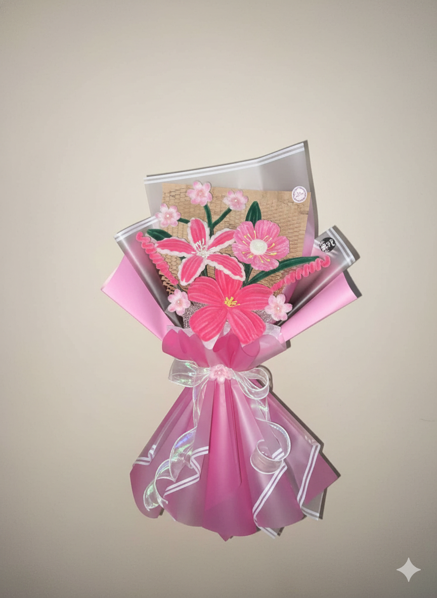This dazzling, handcrafted bouquet features bold pink, lily-style and flat flowers with green foliage, dramatically wrapped in bright pink and clear material. It is a stunning, everlasting gift perfect for conveying cheerful energy and deep affection.