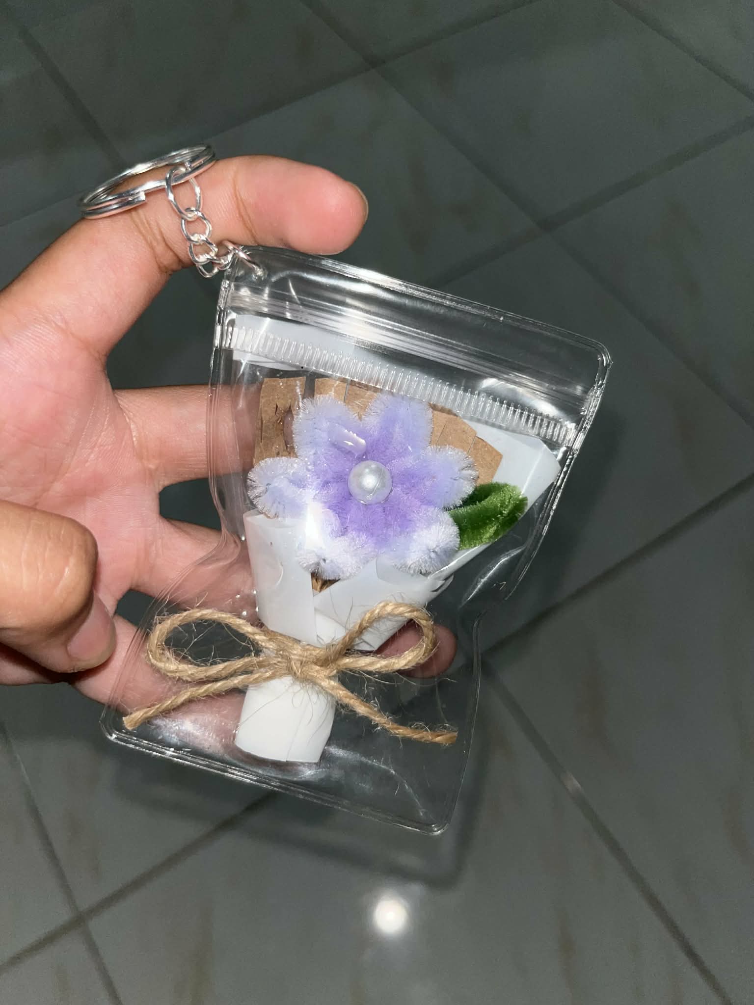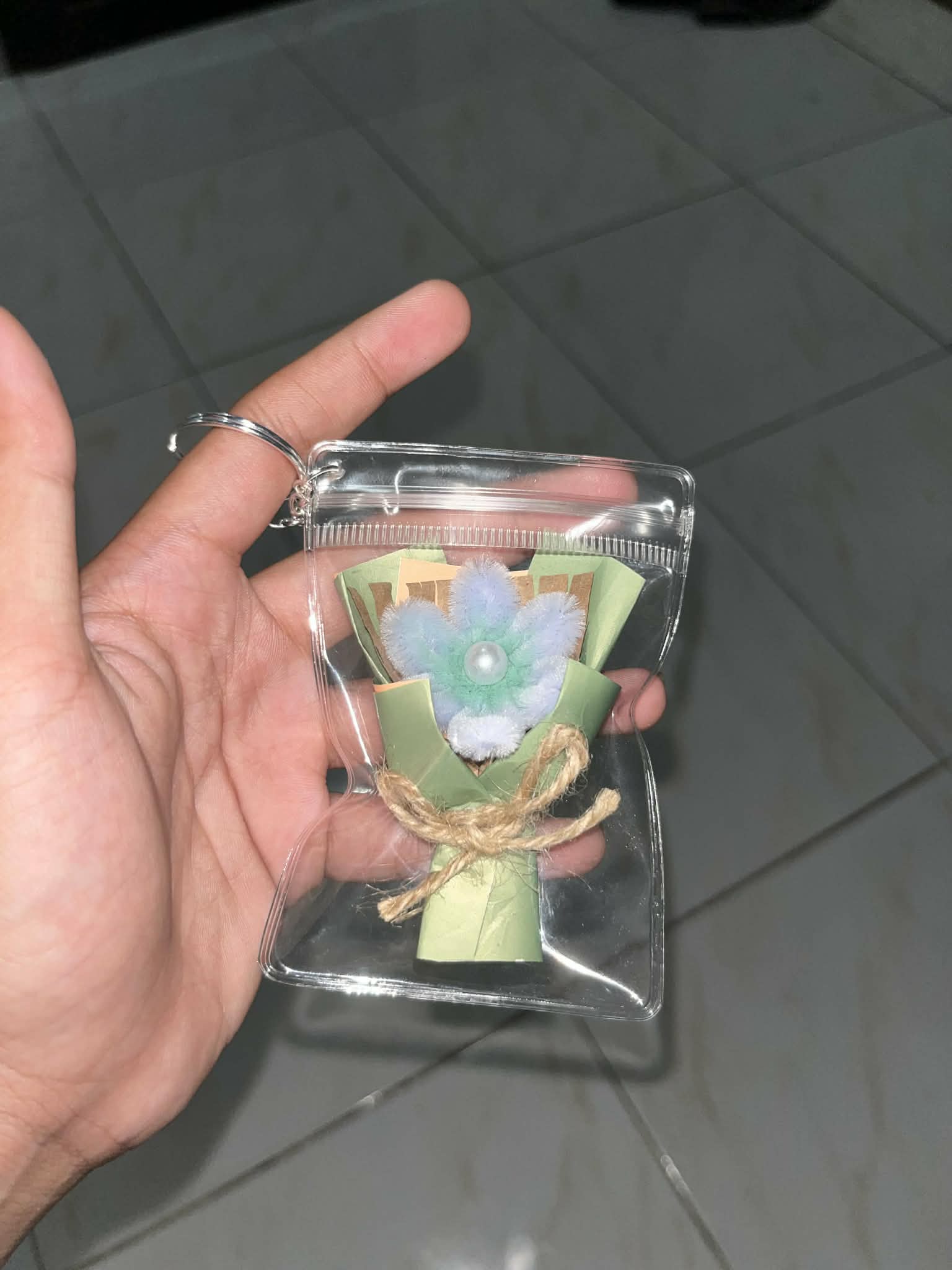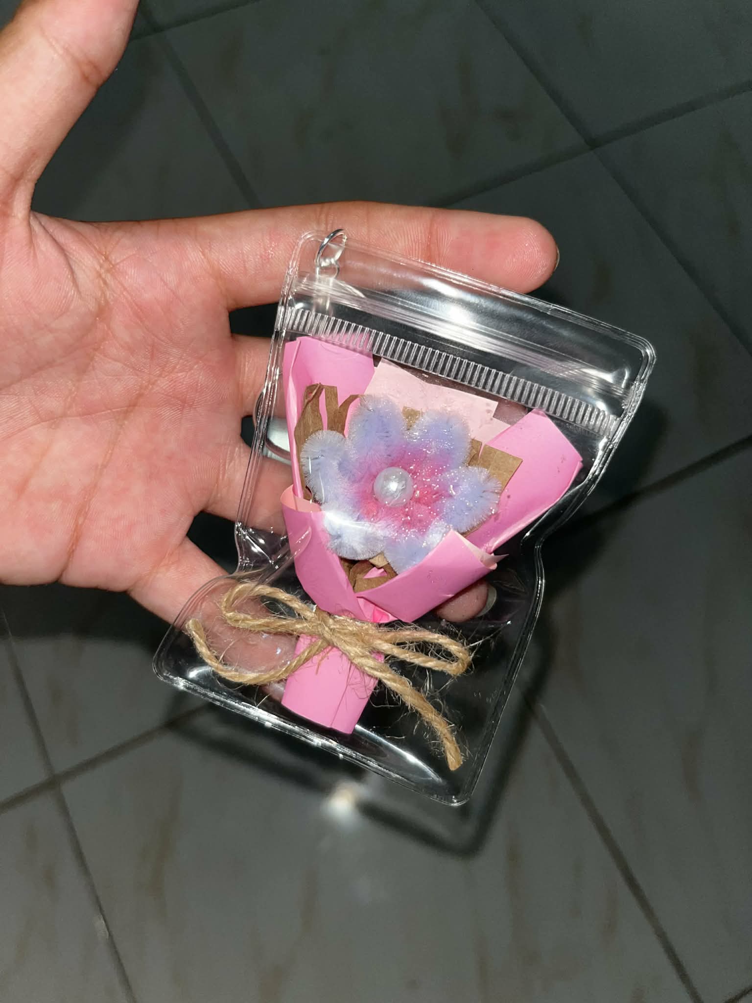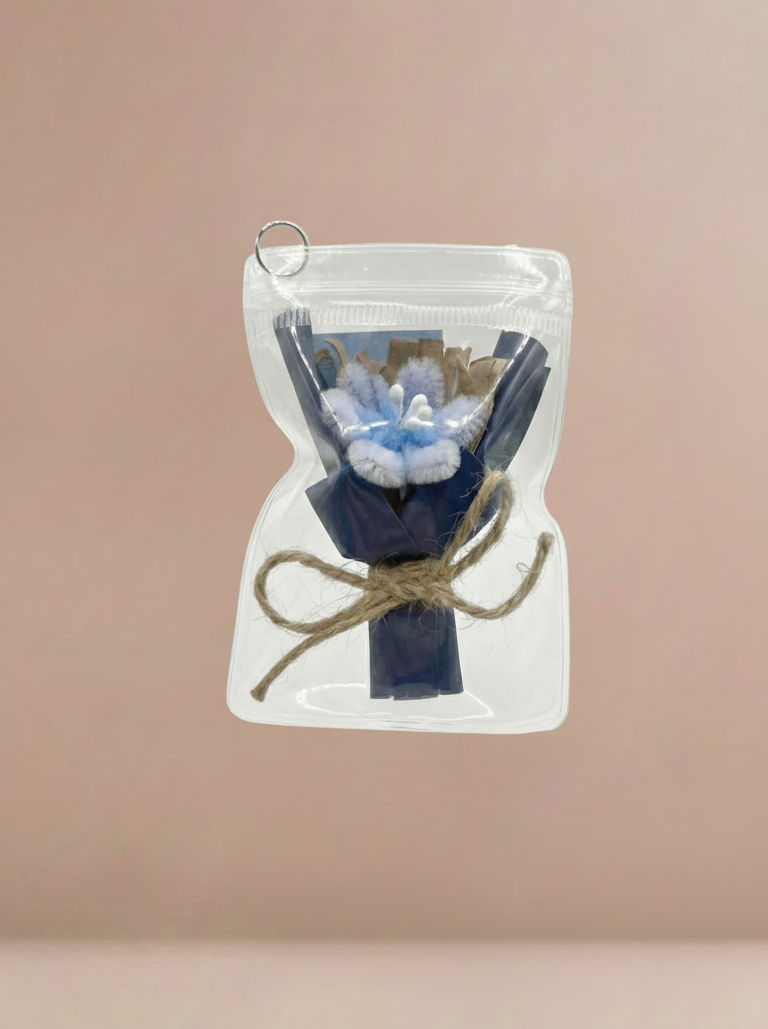A charming mini bouquet crafted with delicate paper petals, soft accents, and a pearl center, neatly wrapped and secured with twine. Encased in a clear pouch with a keychain hook—perfect as a gift, souvenir, or cute everyday accessory 🌼
