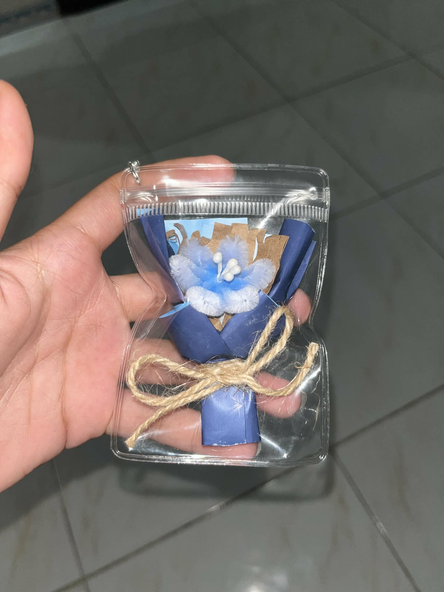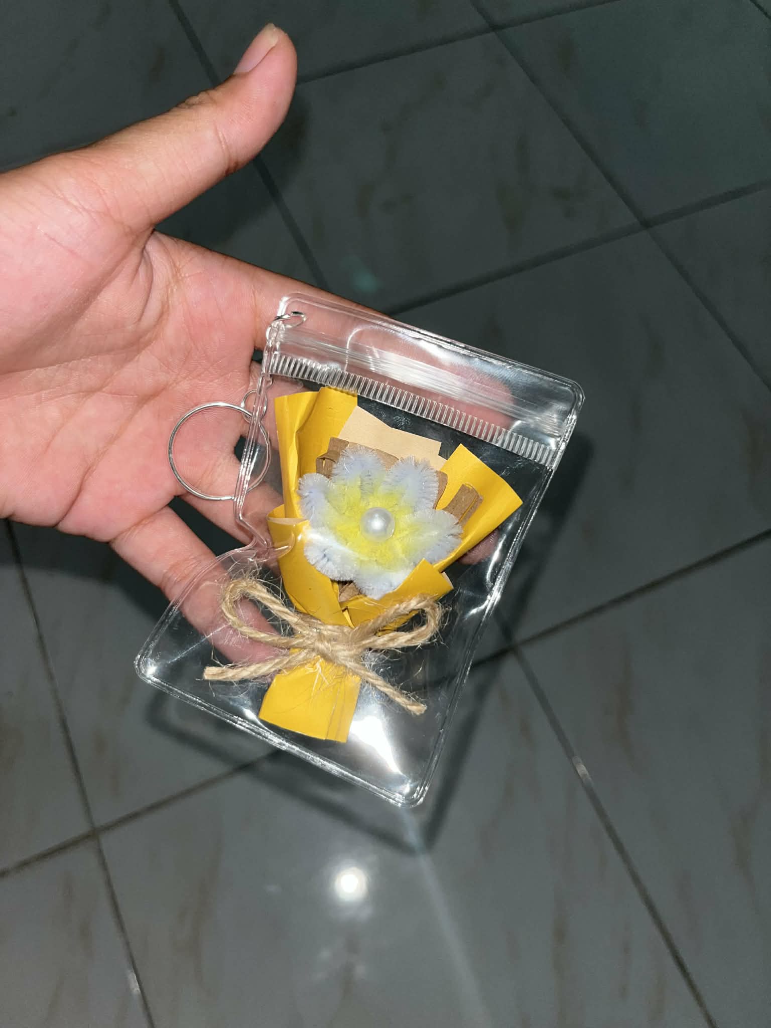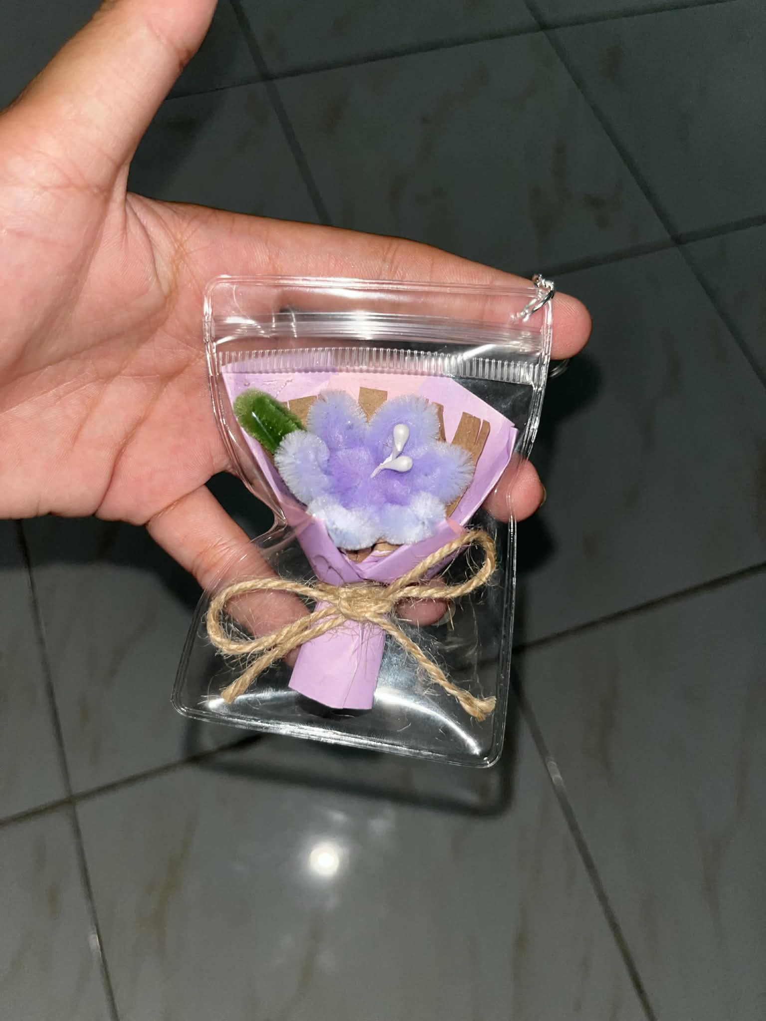 A charming mini bouquet crafted with delicate paper petals, soft accents, and a pearl center, neatly wrapped and secured with twine. Encased in a clear pouch with a keychain hook—perfect as a gift, souvenir, or cute everyday accessory 🌼