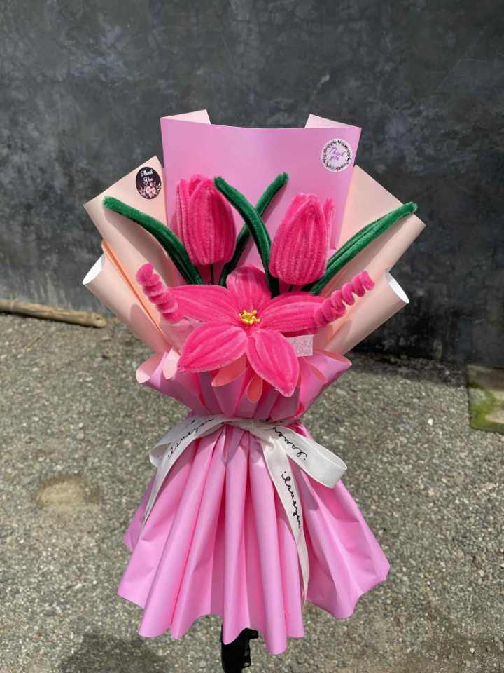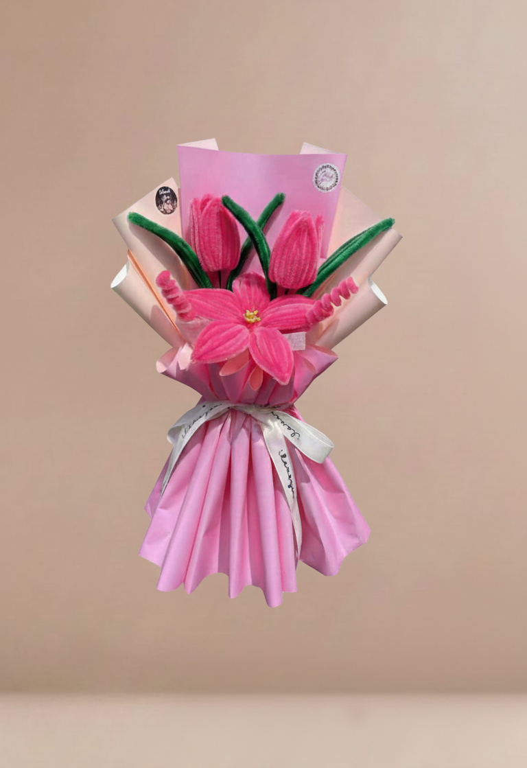 A bold and romantic handcrafted bouquet dominated by rich hot pink and bright fuchsia tones. The arrangement features two closed tulip flowers and one large, open, star-shaped flower, all made from soft, textured pipe cleaners or felt material. Bright green leaves and spiraled accents provide a sharp contrast to the pink flowers. The bouquet is wrapped in layered paper using two shades of pink (a bright hot pink base and a softer salmon-pink backing). It is tied with a crisp white ribbon beautifully imprinted with the cursive words “I love you” repeated across it, making the message clear. This small, permanent arrangement is a perfect, lasting token of love, affection, or gratitude.