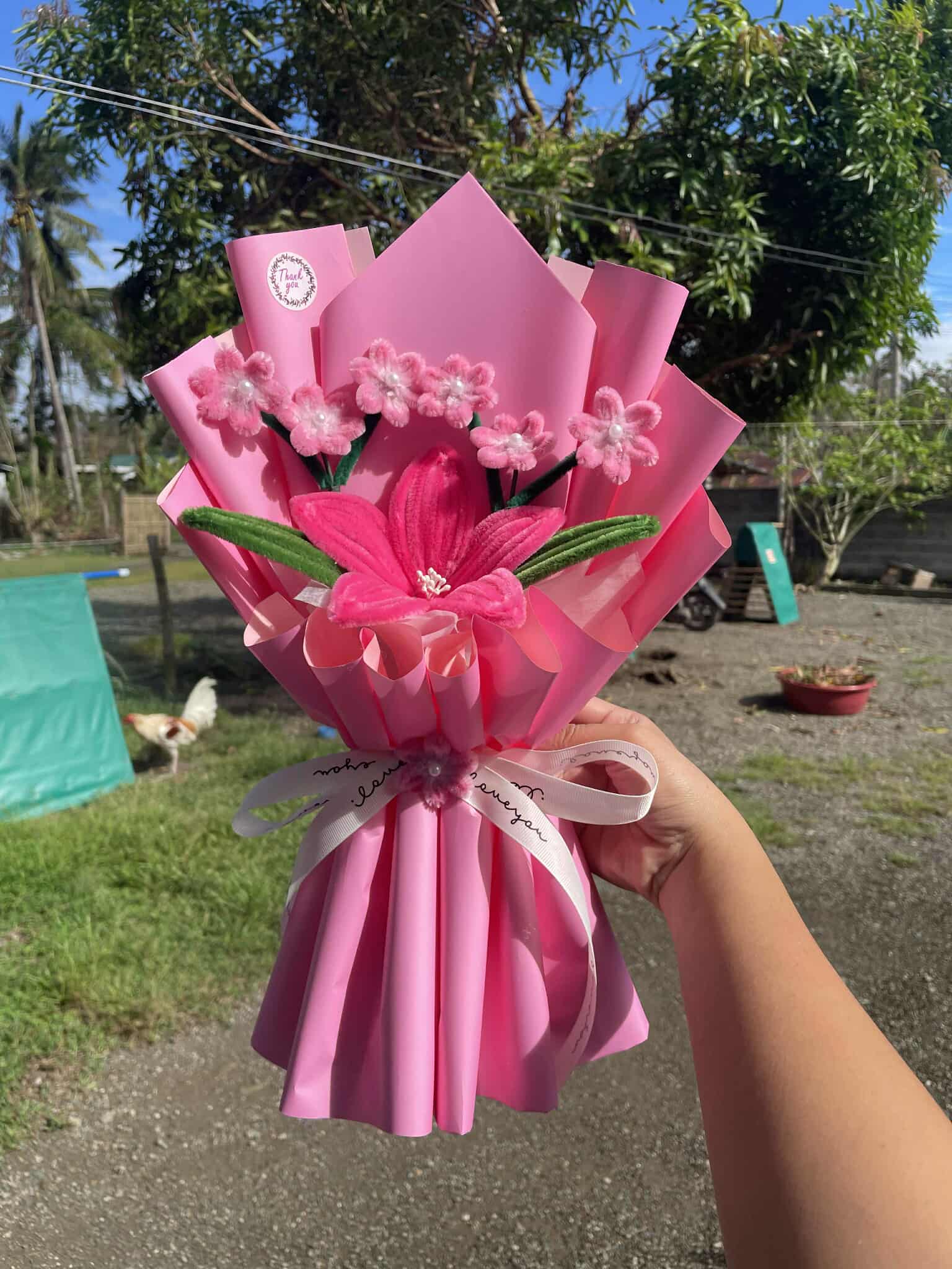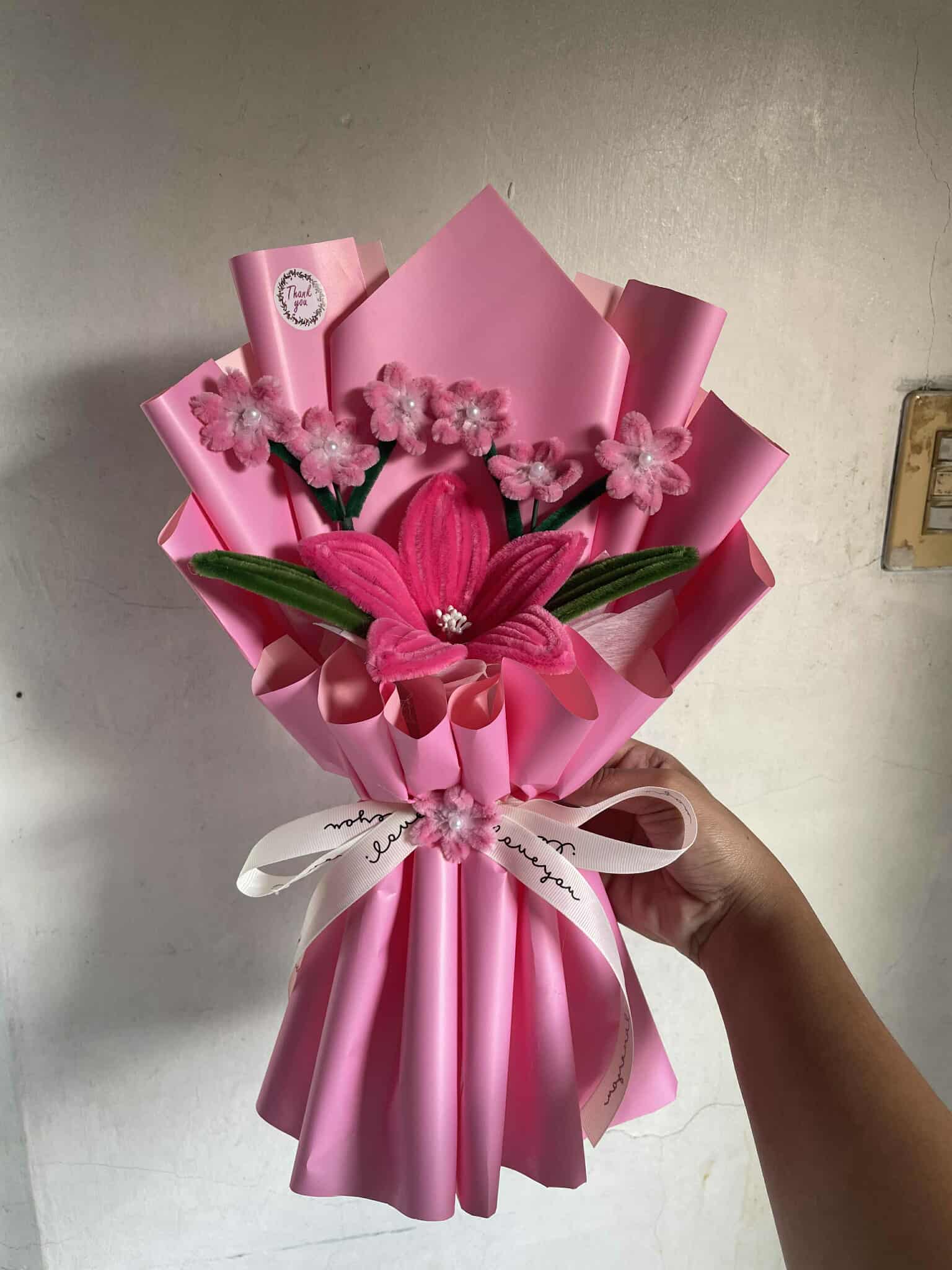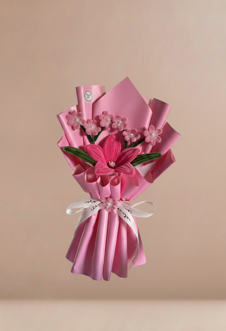 This beautiful, handcrafted bouquet features a large velvet pink center flower and smaller pink accent blooms, wrapped entirely in cheerful pink paper with a white script ribbon. It is an everlasting gift perfect for conveying deep affection and admiration.